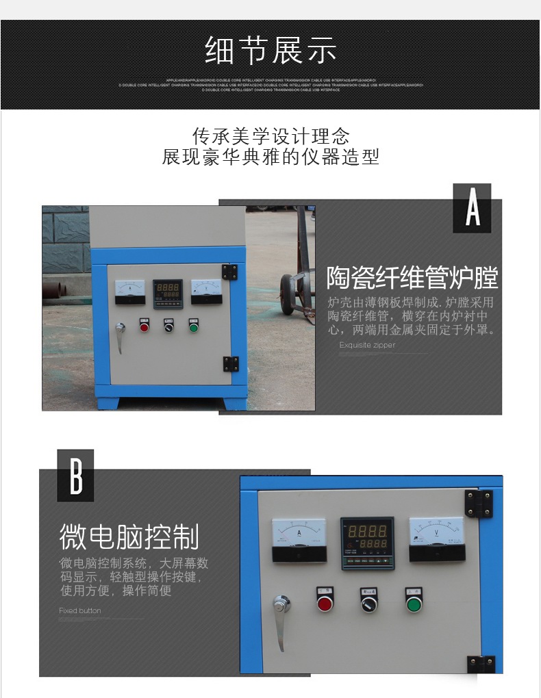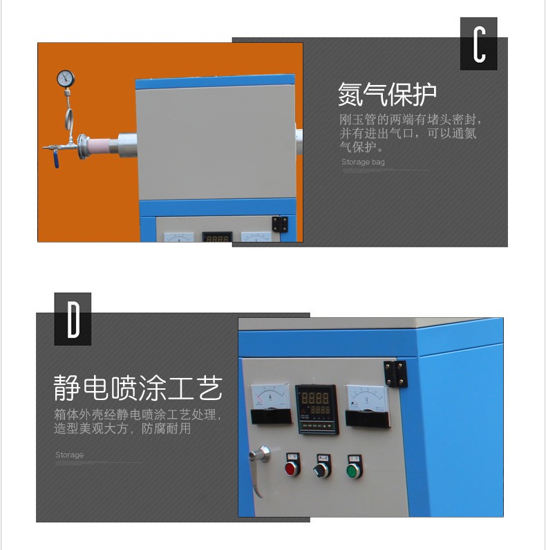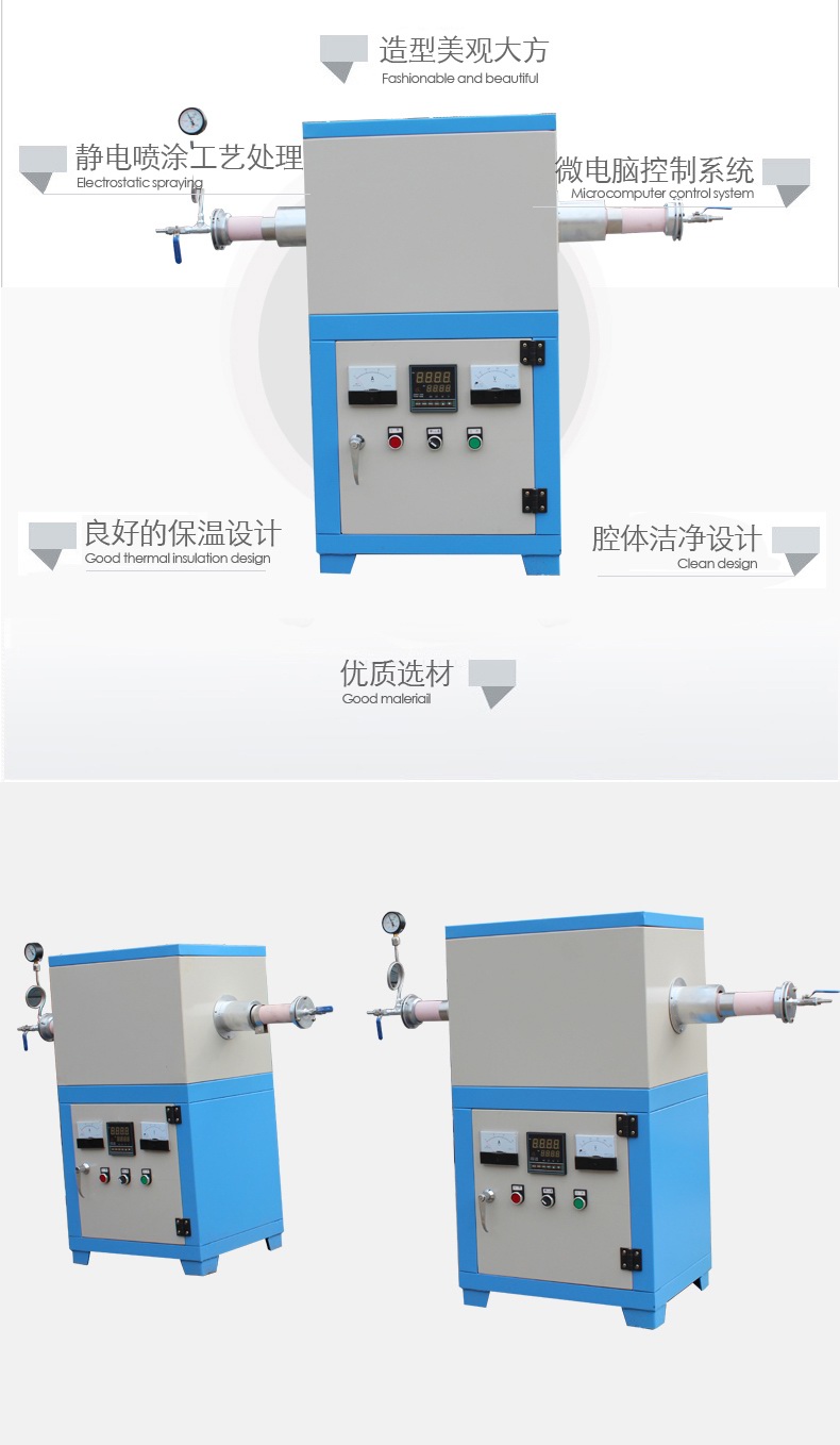 1.外殼采用鋼板這邊焊接而成,外表靜電噴涂,美觀大方。爐膛采用氧化鋁陶瓷纖維材料制成,加熱元件為硅鉬棒。工作室為優(yōu)質(zhì)高密度剛玉管,剛玉管的兩端配有法蘭裝置,可以對爐膛內(nèi)部抽真空。也可以通入氣氛保護(hù)。